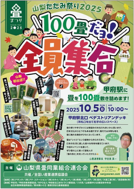 当店加盟の山梨県畳同業組合連合会は、来る10月5日(日)甲府駅2階ペデストリアンデッキ(エレベーター前広場)において、畳100枚を敷き詰めたたみ祭り100畳だよ全員集合と題して参加型イベントを開催します。当日の入場は無料、ワークショップは100円~500円(いぐさコースター作り、和紙のお散歩凧作り、本格的に野立ての抹茶体験、食べるいぐさの販売、い草パウダー入り焼き菓子販売、遊亀公園名物紙芝居おじさん登場、ティックトックで有名ない草農家のイグサック登場、更にい草で作る芳香剤)などなど盛りだくさんのワークショップ他、子供から大人まで楽しめるいイベントになっております。子家族そろってお越しください。私もスタッフとして会場におりますのでお声がけください。(*^-^*)
